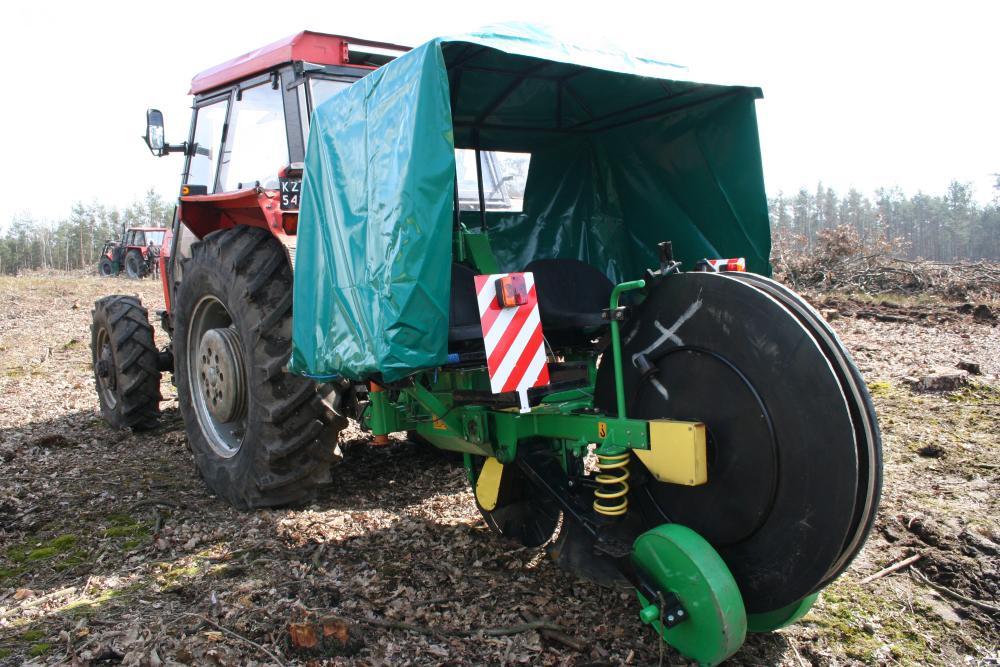 The planting machine is equipped with front cutting blade to protect the machine (especially the plough) from excessive overloads and the shape of the plough guarantees preparing a proper furrow into which plants are fed using rubber disks. The construction of the forest planting machine allows for planting seedlings of deciduous trees, but with a proper and careful handling it can also be used for planting coniferous trees (e.g. 2-year pine).