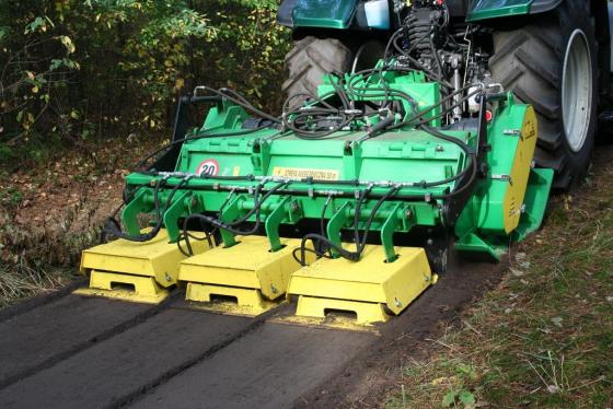 The new construction allows for a preliminary compaction of the shredded road material during one work ride. As a result, such aggregation of equipment makes road building or road repairs more efficient but it also requires application of a more powerful and heavier tractor (due to a big weight raised in the transport position). Like in the previous construction RSD20-PW has been designed for shredding the surface of dirt roads that are covered with turf or roads partially treated with rubble or asphalt waste.