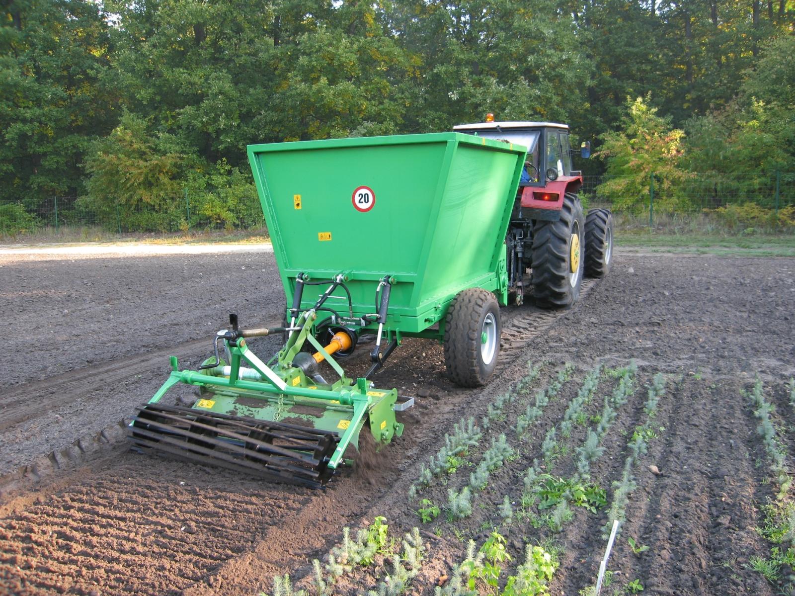 Der Substrat-Streuer SRS für Forstbaumschulen ermöglicht eine gleichmäßige Verteilung des früher vorbereiteten Substrats auf der Oberfläche. Das auszubringende Substrat wird mit einstellbarer Geschwindigkeit dosiert, mit der oberen Bodenschicht vermischt und mit einem Krümler angewalzt. Der Streuer wird insbesondere für gegen Austrocknung empfindliche Substrate empfohlen, weil die Einarbeitung in den Boden im Anschluss an die Ausbringung erfolgt.
